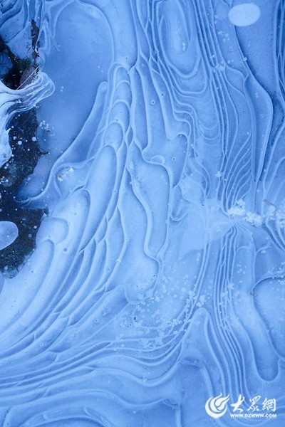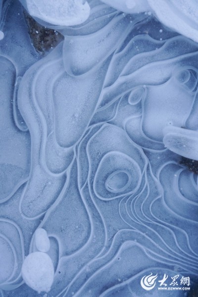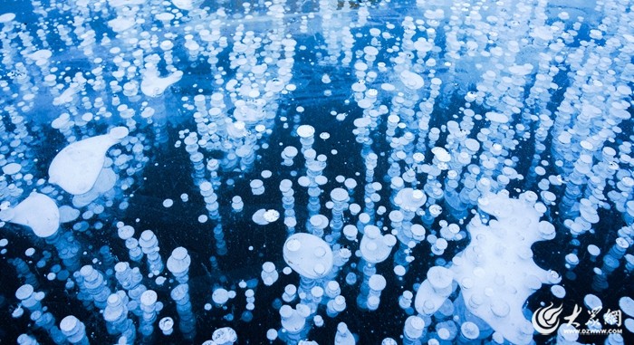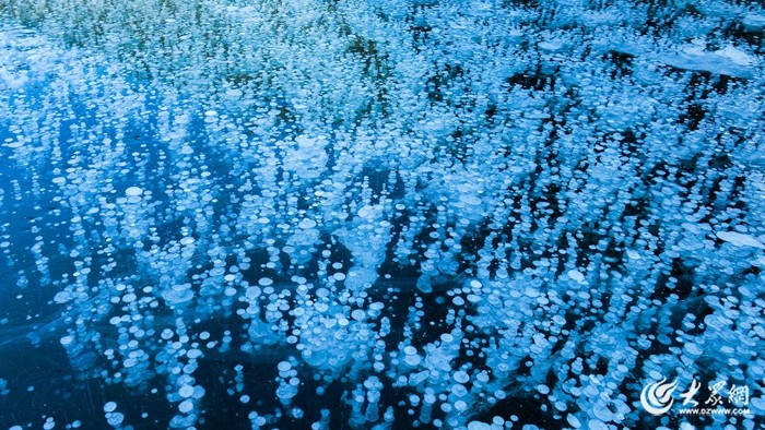 奇妙的冰泡也奇观也悄然呈现。透过冰面,可以看到一串串晶莹剔透的气泡被“封印”在冰层之中,远远望去,这些“冰泡”犹如漂浮在冰层里的珍珠,千姿百态,如梦如幻。