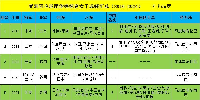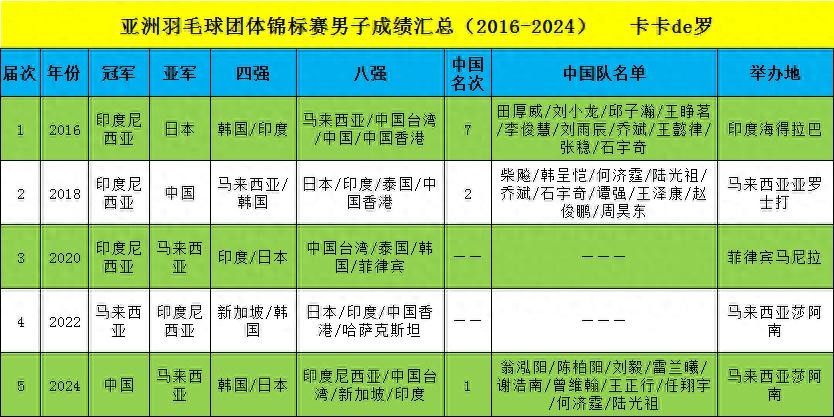亚洲羽毛球团体锦标赛成绩汇总(2016-2024)