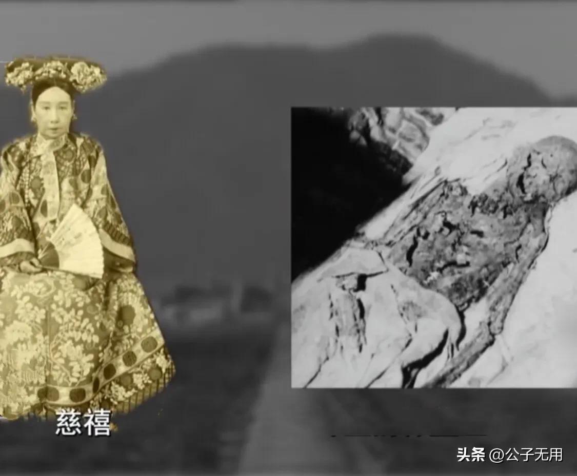 孝钦显皇后(慈禧)遗体背卧于仰置之椁盖上,上身坦露,附体之衣被扒光,白皮贴骨,呈现拳头大小斑痕数块。惨无人道之状目不忍睹,笔难尽述。”