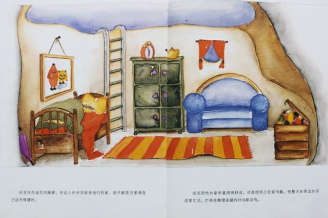 哈克住在迪克的隔壁。牙齿上的牙洞就是他们的家,房子都是兄弟俩自己动手修建的。哈克把他的家布置得很舒适,但是他很少在家待着。他整天在旁边的牙齿里忙活,忙得连整理床铺的时间都没有。