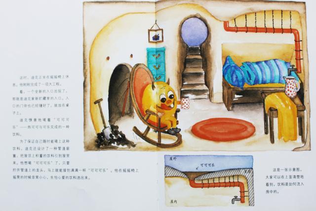 看,一个全新的入口出现了,那就是迪克家新储藏室的入口。入口的门帘也已经缝好了,就放在桌子上。迪克惬意地喝着“可可可乐”——热可可和可乐兑成的一种饮料。