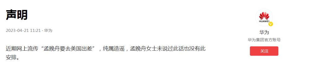 华为集团 4 月 21 日发布声明称:" 近期网上流传‘孟晚舟要去美国出差’,纯属造谣,孟晚舟未说过此话也没有此安排。"