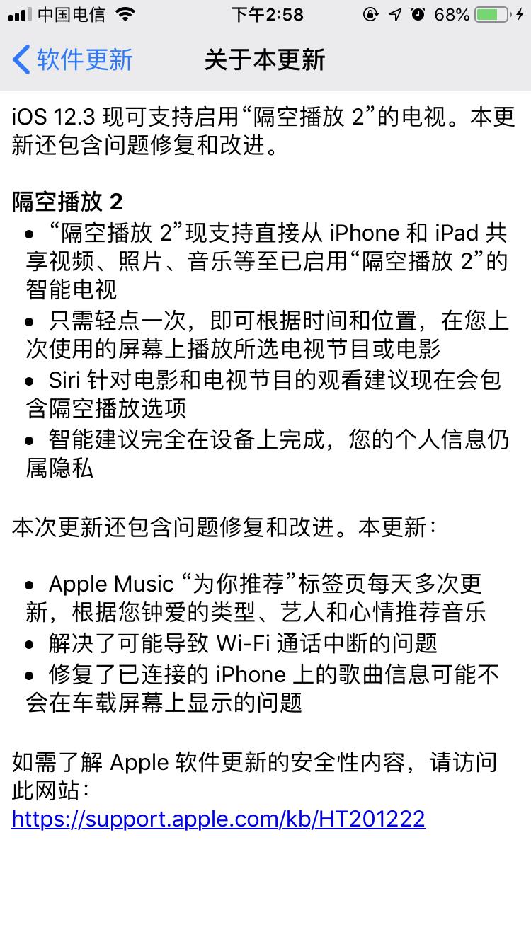 而除了这些苹果表明出来的更新之外,此次iOS 12.3还有一些看不到的重要更新优化。首先得益于全新的 Swift 5 适配,所有的 iOS App 都比之前的体积有所缩减,而且启动速度更快,iOS 12.3 在操作感上会比之前流畅,待机时间估计也会有小幅的提升。另外,除了 iOS 12.3,苹果还发布了 macOS 10.14.5、watchOS 5.2.1 和 tvOS 12.3 系统更新,同时还为 HomePod 发布最新的 12.3 软件更新(配对的 iOS 设备升级至 iOS 12.3 后可自动安装更新)。