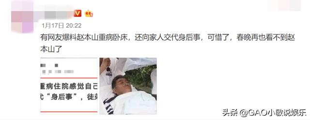 1月17日,有网友反映,赵本山身体不好,重病在院后觉得自己快要走了,甚至要交代后事,旁边的家人都很悲伤。赵忠祥刚去世,赵本山再次传出这样的消息,也引起网友热议。