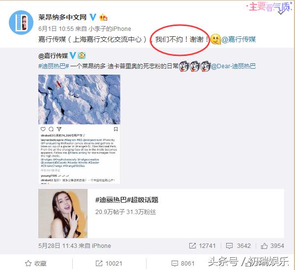 6月1日,迪丽热巴在小李子INS里留言,表示自己是粉丝,希望他多发自拍,署名一个莱昂纳多·迪卡普里奥的死忠粉的日常。此条留言直接被“莱昂纳多中文网”拒绝:我们不约!谢谢!