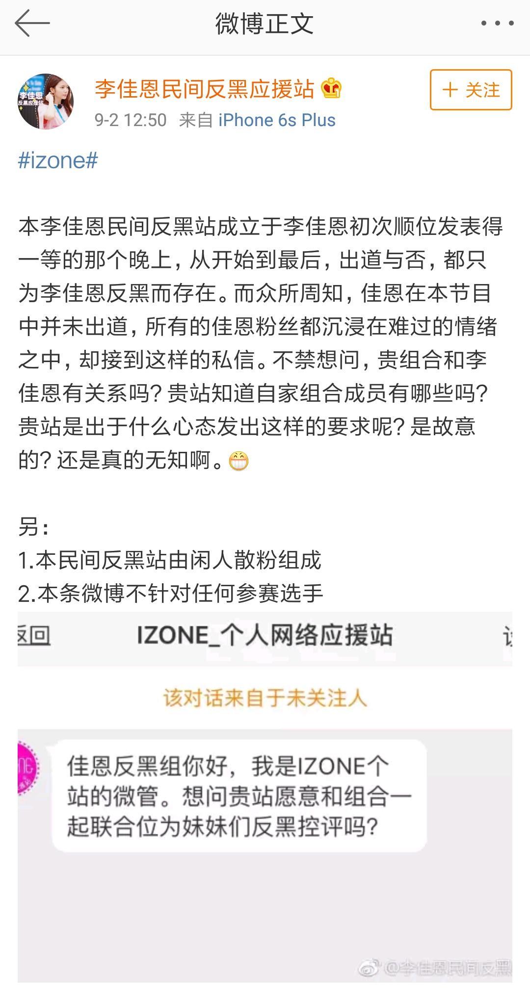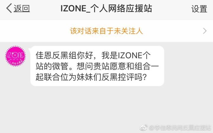 但有些令人奇怪是,微博的“李佳恩民间反黑应援站”发文称IZONE应援站私信请求与其一起为IZONE反黑而努力。李佳恩应援站顿时气愤不已,直接发微博讽刺,“贵站知道自家组合的成员有哪些吗?贵站是出于什么心态发出这样的要求呢?是故意的?还是真的无知啊。