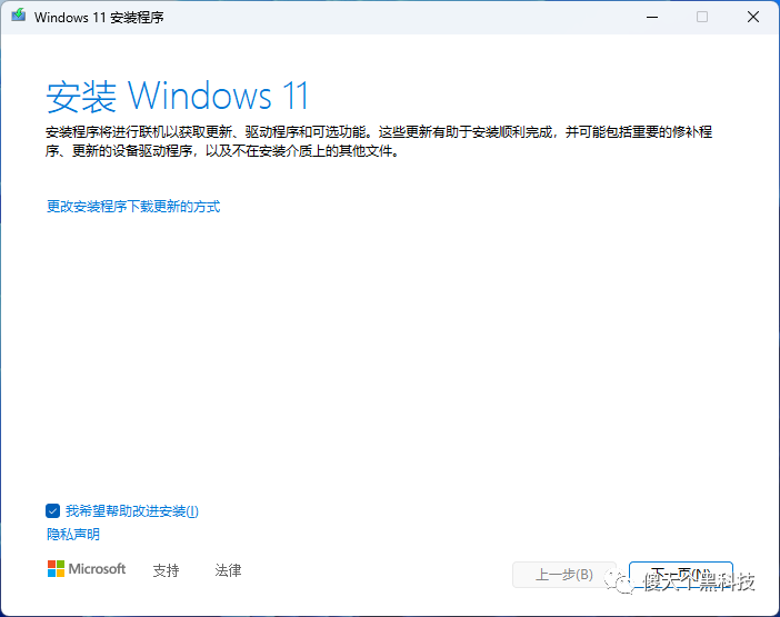 解压缩 ISO 文件到非系统盘(一般系统盘在 c 盘),打开解压缩后的文件夹,双击 setup.exe。选择”更改安装程序下载更新的方式”,然后选择”不是现在”。