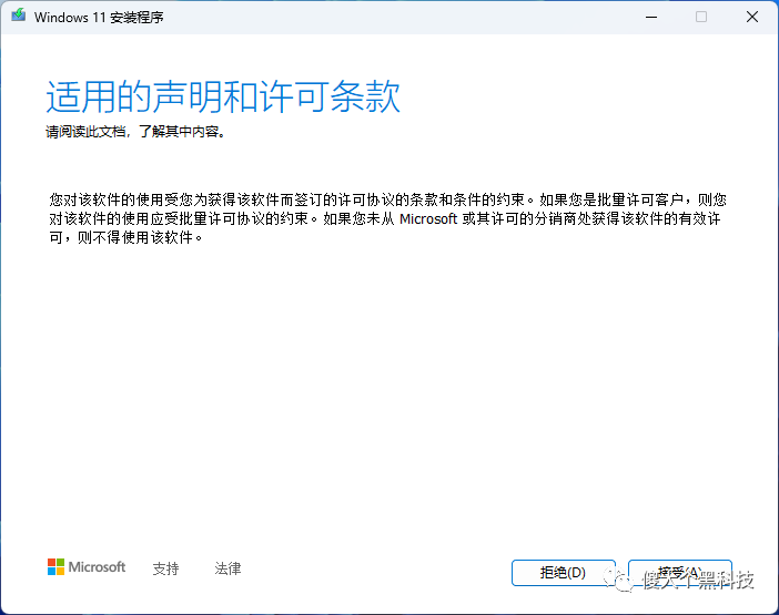 如果升级的电脑硬件符合的条件,将看到许可协议界面,接受许可协议。