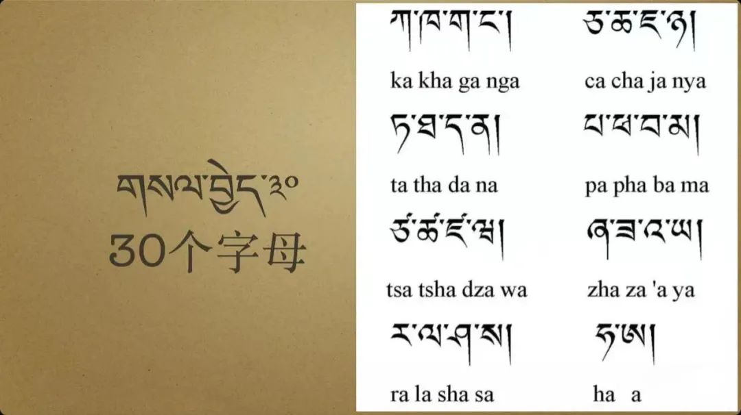 藏文有30个基本字母,藏文写法通常由基字、下加字、前加字、元音符号、后加字、再后加字构成。