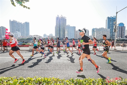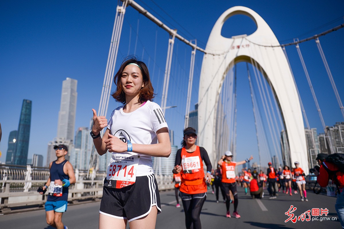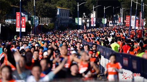 12月8日,由中国田径协会、广州市人民政府共同主办的2019广州马拉松赛在天河体育中心鸣枪起跑,共有30000名选手参加。图为参赛选手在比赛中。(广州马拉松组委会)