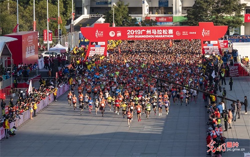 12月8日,由中国田径协会、广州市人民政府共同主办的2019广州马拉松赛在天河体育中心鸣枪起跑,共有30000名选手参加。图为参赛选手出发。(广州马拉松组委会)