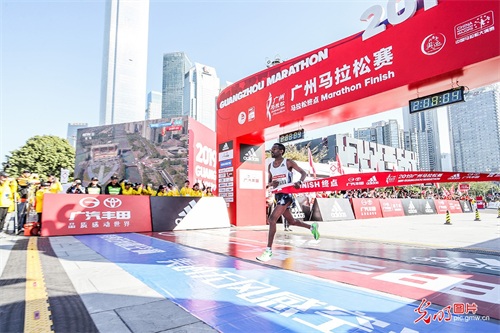 12月8日,由中国田径协会、广州市人民政府共同主办的2019广州马拉松赛在天河体育中心鸣枪起跑,共有30000名选手参加。图为参赛选手冲向终点。(广州马拉松组委会)