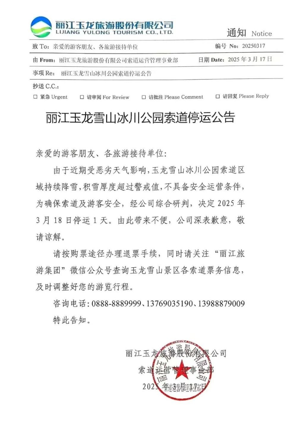 因近日冰川公园索道沿线持续降雪,积雪厚度超过警戒值,不具备通达条件,为确保游客安全,经公司研判,决定2025年3月18日玉龙雪山冰川公园索道全天停止运营。由此带来的不便,公司深表歉意,敬请谅解!