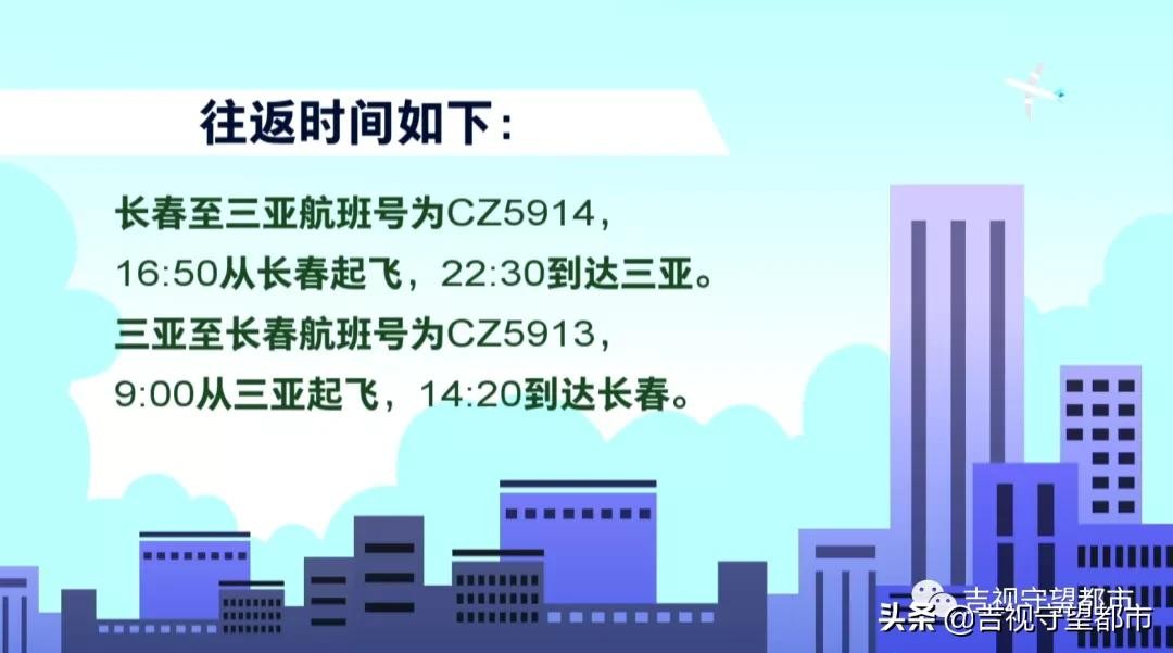 长春至三亚航班号为CZ5914,16:50从长春起飞,22:30到达三亚;三亚至长春航班号为CZ5913,9:00从三亚起飞,14:20到达长春。