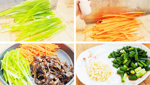 所需食材:胡萝卜 肉 鸡蛋 淀粉 木耳 莴笋 葱姜蒜