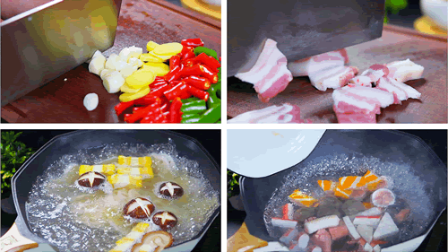 7、锅中烧油,放入五花肉煸炒,煸炒出里面的油脂,然后再放入青椒 红椒 大蒜 炒出香味,再放入麻辣香锅的调味料,