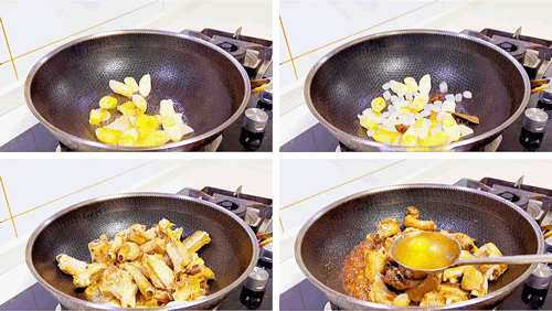 5、锅中烧油 放入排骨煸炒,炒干排骨表面的水分,然后再继续炒,煸炒出里面的油脂,排骨炒到焦黄的时候,直接盛出备用
