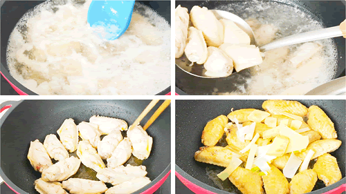 3、锅中烧油,放入鸡翅小火慢煎,一面煎孩子焦黄的时候,翻面继续煎另一面,两面都煎至焦黄