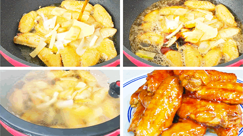 4、鸡翅煎到焦黄酥脆的时候,放入葱片 姜片 然后再倒入可乐 ,接下来开始调味,添加盐 蚝油 白糖或者冰糖、料酒 、生抽、调味,大火煮开,煮2分钟,然后再转小火继续炖10分钟