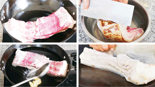 1、准备一块上等的五花肉,先把五花肉给清洗一下,然后再把五花肉的肉皮给烧一烧,这样可以去掉表面的绒毛,也可以去腥,烧过之后,放水中浸泡,然后把烧焦的部分给刮一刮,再给洗净