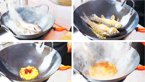 4、锅中烧油,油热之后,放入腌制的鲤鱼,小火慢煎,一面煎至焦黄的时候,翻面继续煎另一面,鱼小火煎,这样才能给煎入味,鱼煎好之后,直接盛出备用