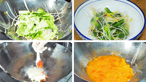 5、起锅烧油,放入葱姜辣椒炒香,然后再放入豆芽 青菜炒一炒,大火爆炒,可以有效防止青菜出水,炒到青菜微微变软的时候,添加少许盐,翻炒片刻,盛入盘中,备用