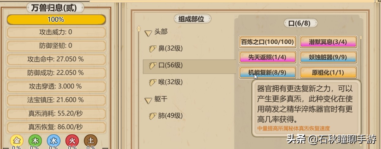 [机能复新]要用萌发之精华淬炼才出,这个只能在春天通过吐纳来获取。想要提高吐纳效率的话,就得强化鼻、喉、肺三个器官的基础百炼,而且这三个器官还能提高真炁恢复,又是万兽归息秘体的组成部分,所以练完口胃肠就来炼它。