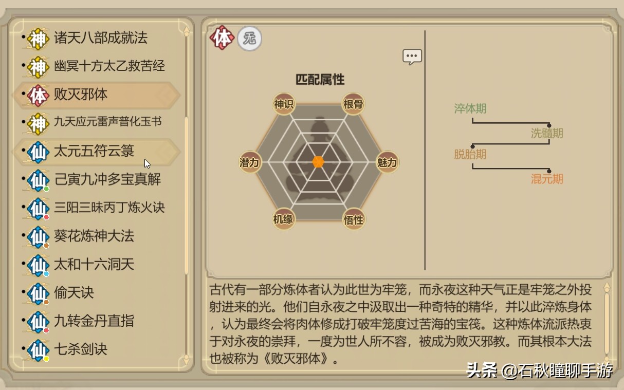 败灭邪体:很强的功法,但对稀有精华的需求非常苛刻,如果不是家里漫山遍野的天材地宝,不要学。而且这个功法还要求各种永寂之精髓,只有在永夜环境下吐纳才能获得,上手难度非常大。