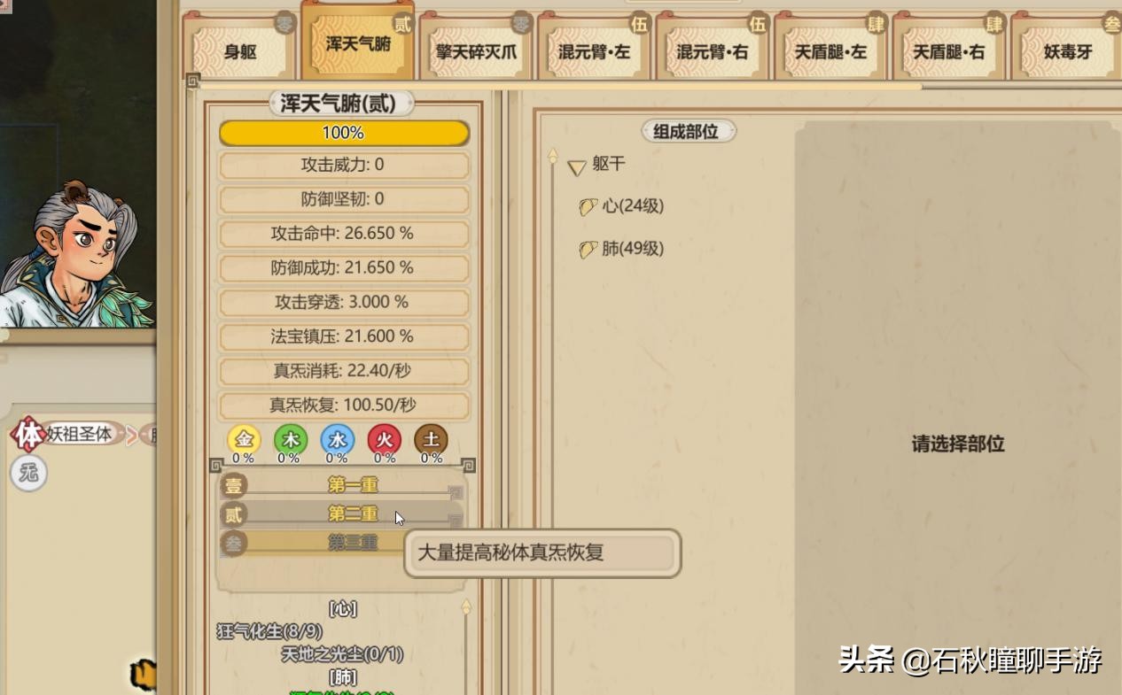 这样就能解锁[万兽归息]秘体,提高真炁的恢复效率,然后我们就能把混元臂天盾腿装备上也不会掉真炁了。万兽归息就好比是发动机,没有这个秘体光靠基础那点回气能力,你的体修根本战不动。