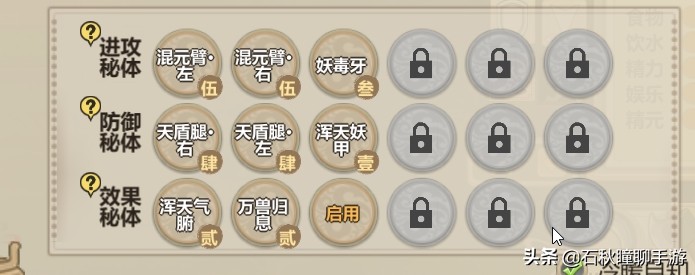 一开始的淬体期只能淬炼肌肉和毛皮。混元臂和天盾腿这两种基础秘体是最优先解锁的,我们先来淬炼这两个秘体所属的肌肉。