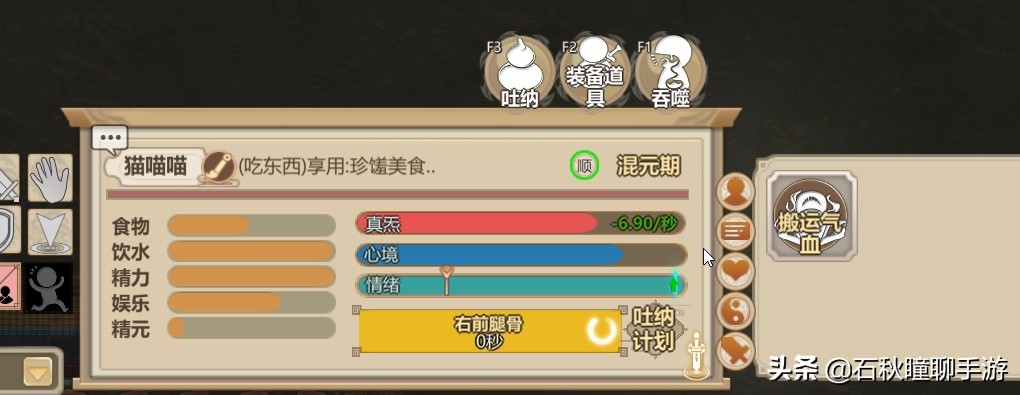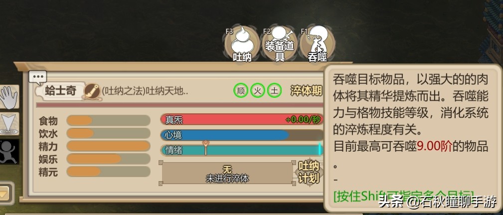 体修在没有炼口胃肠以前,一般只能通过吐纳获得精华,我测试并整理了吐纳相关的精华获取方式: