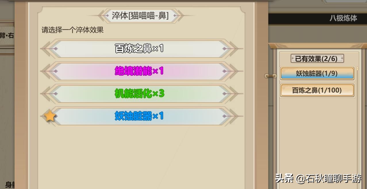 二是词条有上限,前期至多只能存在六个词条,其中[百炼XX]、[原祖化]及秘体所需词条已经占去3~4个词条位了,你要考虑清楚给其他词条预留空间。