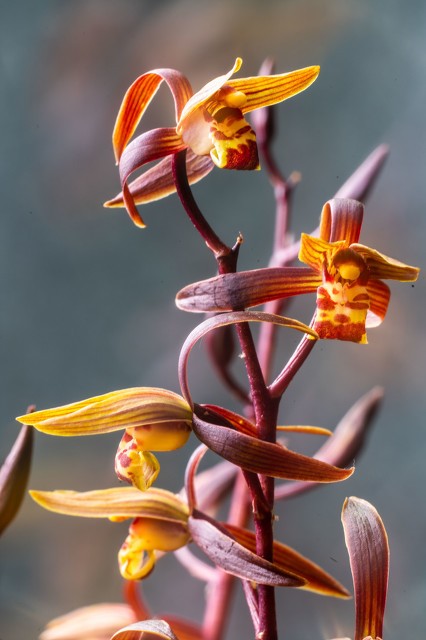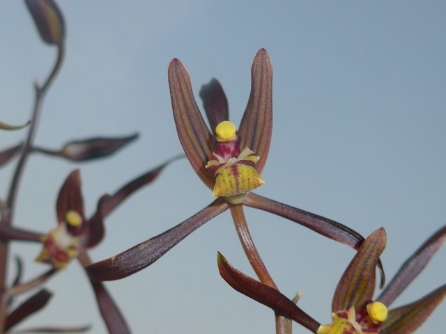 墨兰假鳞茎比较大,呈椭圆形,长2至4㎝,宽2㎝左右。根白色,根的直径大约0.3至0.5㎝,长25至35㎝。花葶直立,高出叶架,花朵6至18余朵,花朵展开直径大约2.5至4.5㎝。花苞衣不大,基部有蜜腺,萼片和花瓣较狭,花色多呈浅紫褐色,缀有5条深紫色条纹。唇瓣下垂反卷,上缀有紫红色斑点。花期在12至翌年2、3月,正值春节期间开放所以人们也称“报岁兰”!香味来说,有的具甜香,有的香味很淡,有点檀香的感觉。!