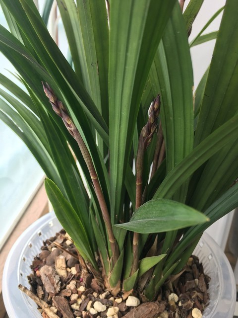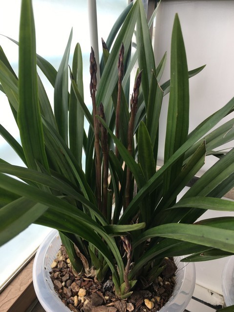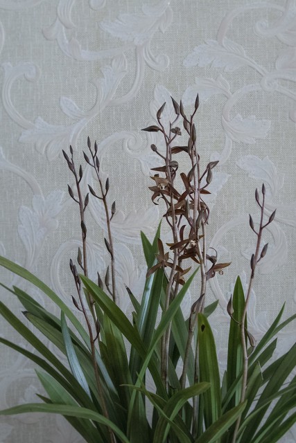 墨兰又称报岁兰,叶片宽阔而亮丽,2一5片叶生于假鳞茎上,一般宽习为2至3㎝,长20至70㎝,呈剑形,且直立,叶缘无锯齿。