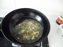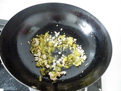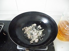 3. 锅内放油,放入姜煸炒出香味后放肉末翻炒。
