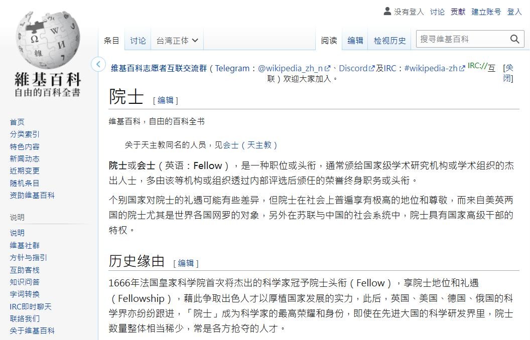 1666年法国皇家科学院首次将杰出的科学家冠予院士头衔(Fellow),享院士地位和礼遇(Fellowship),藉此争取出色人才以厚植国家发展的实力,此后,英国、美国、德国、俄国的科学界亦纷纷跟进,「院士」成为科学家的最高荣耀和身份,即使在先进大国的科学研发界里,院士数量整体相当稀少,常是各方抢夺的人才。