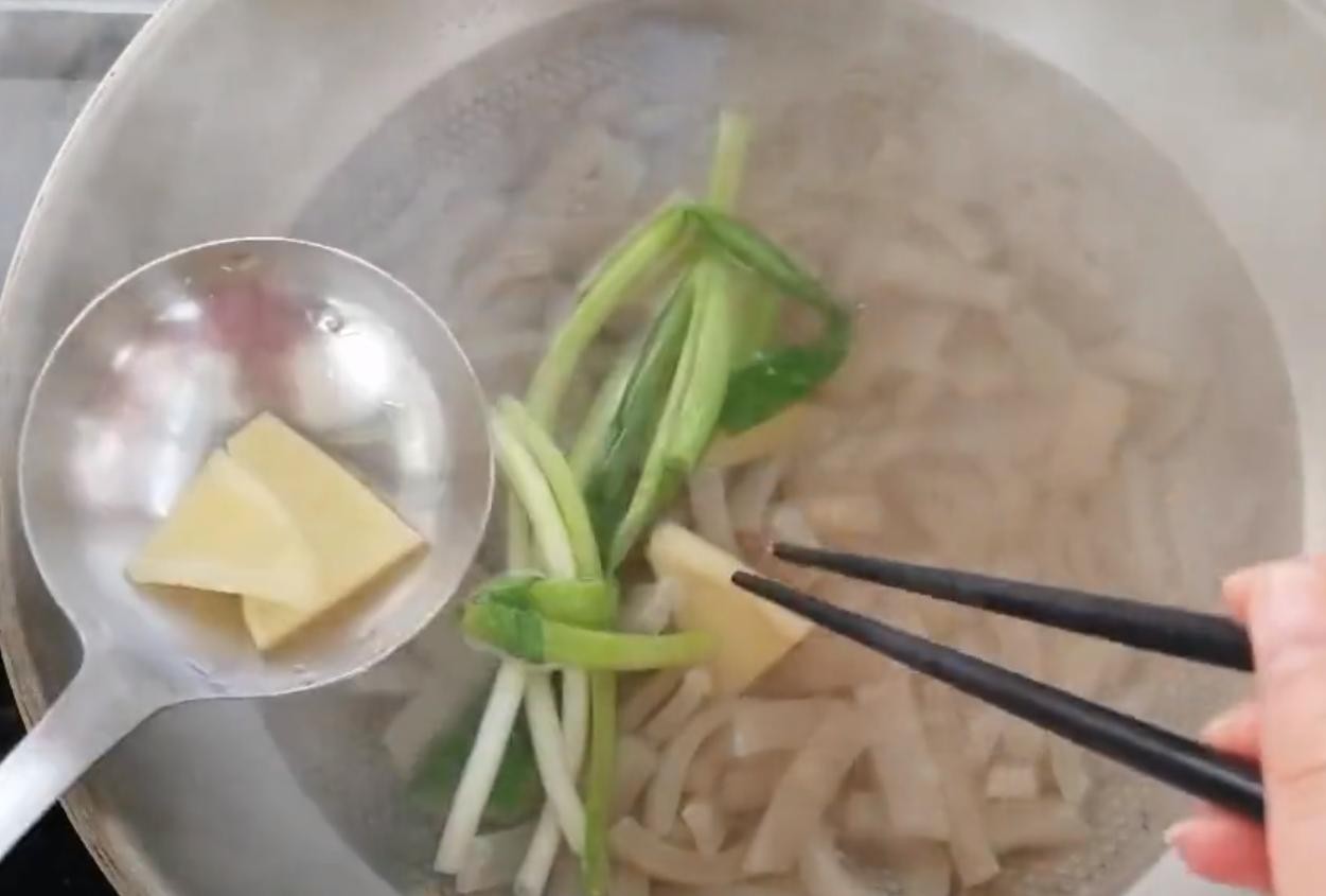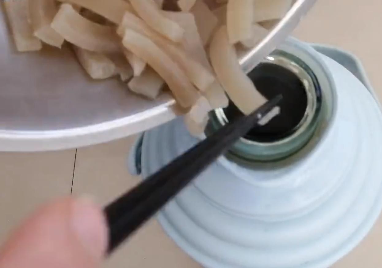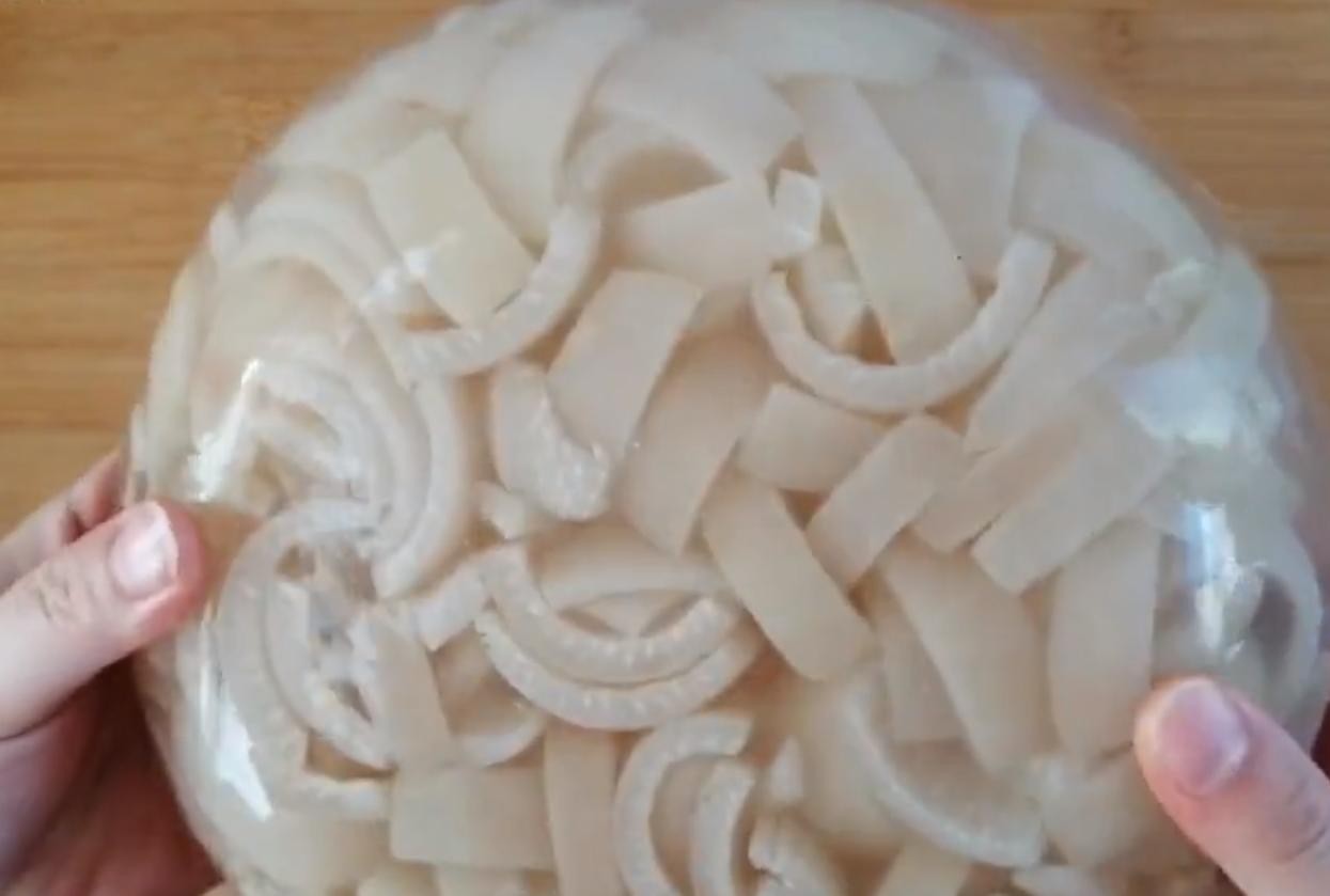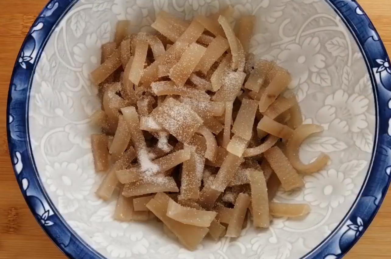 3,切成小细条放入碗中加入两小勺食盐用手抓拌揉搓,揉至3分钟使食盐融化,加入温水清洗3遍左右,清洗至水清澈为止。