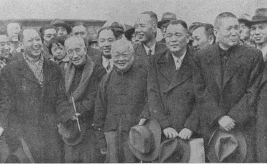 1949年国民党和谈代表团赴北平前在南京机场合影(右起张治中、黄绍肱、刘斐、邵力子、章士钊)