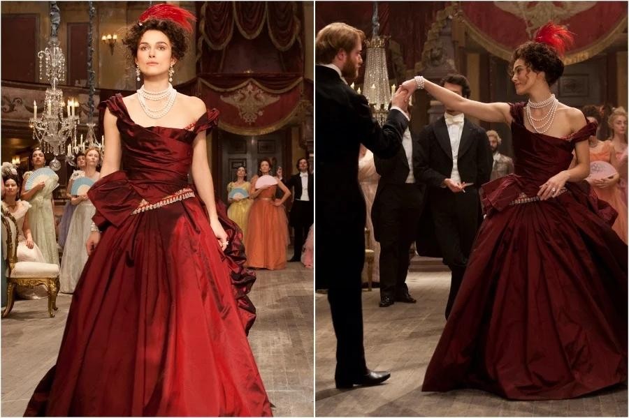 这部电影里的造型在业界大受推崇,甚至赢得了当年的奥斯卡最佳服装奖。饰演安娜的凯拉·奈特丽(Keira Knightly )参加舞会时穿的这条酒红色蝴蝶结丝绸晚礼服既符合影片时代背景,又美得让现代的观众瞠目结舌。