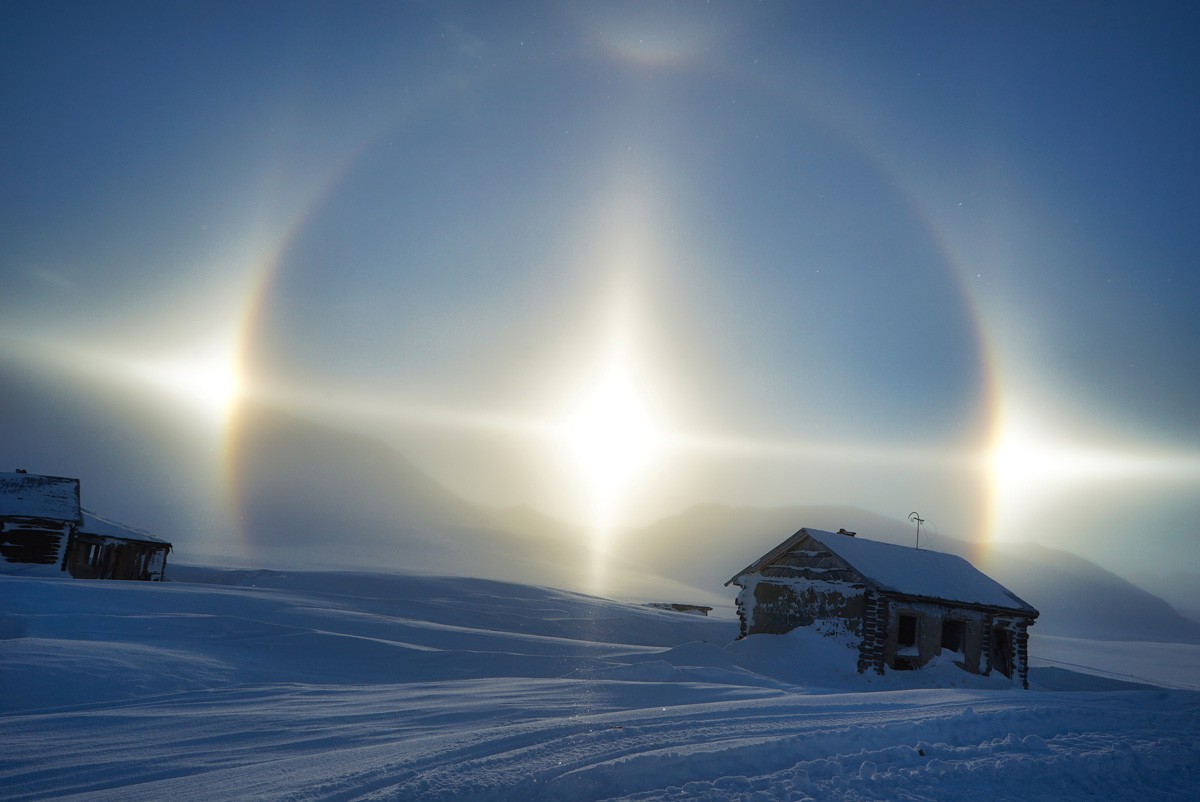 摄影师幸运捕捉到四个太阳当空照的画面。(日晕,一种大气光学现象。日光通过卷层云时,受到冰晶的折射或反射而形成。)