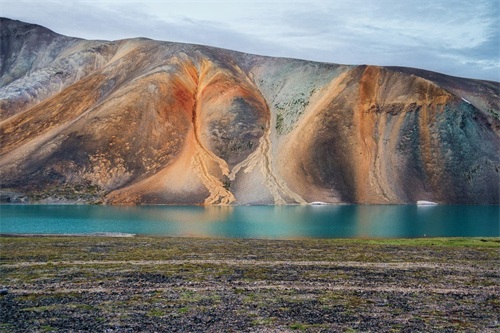 由于褐铁矿的渗出,山丘渲染出橙色,与澄澈湖水相映衬,美不可言。