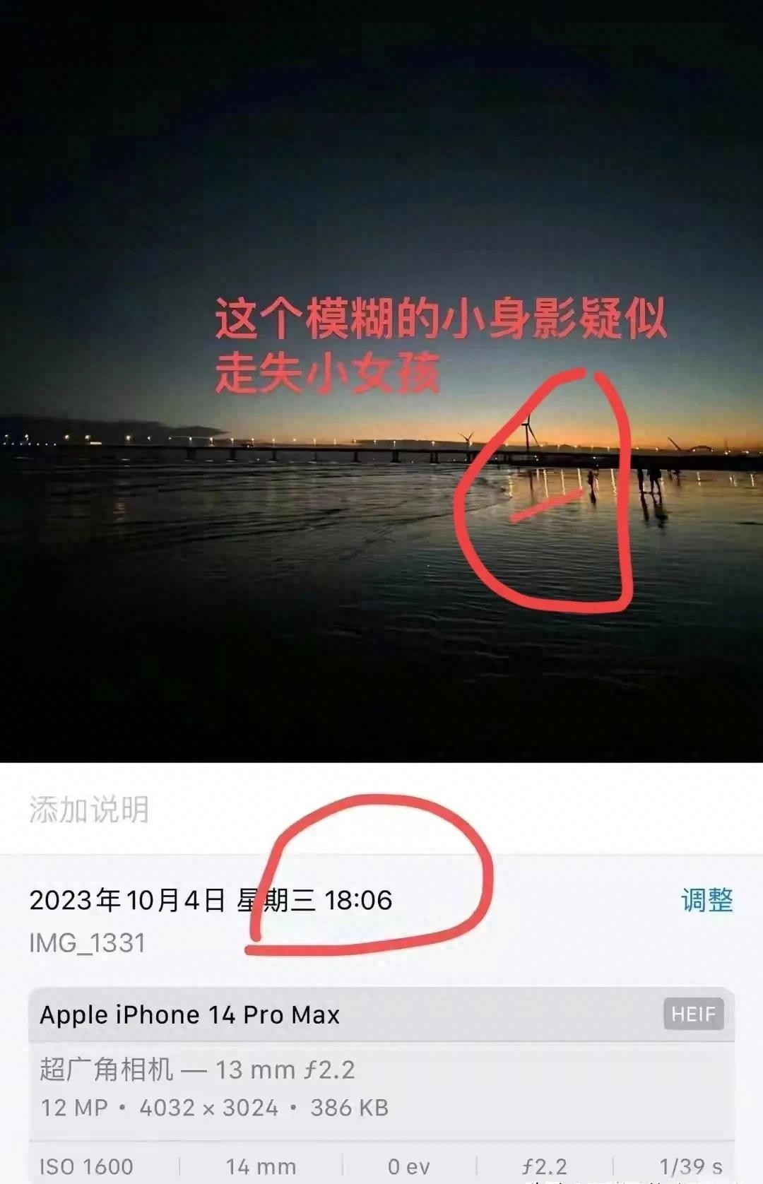 在这组照片中,可以看到当时天色已经完全黑了,拍摄照片的网友通过仔细辨认,可以看到几个模糊的身影,其中有两个成年人的身影,旁边还有一个孩子的小身影。女童父亲经过确认认为这个小身影和之前有网友提供的17点53分的照片中的孩子很像。虽然这张照片的拍摄时间是18:06分,而之前警方通报的孩子在海边摔倒后消失的时间是17:54分左右,但这个新线索的出现让人们重新燃起了希望,大家都在期待奇迹的发生。虽然时间已经过去了四天,女童的生还希望变得越来越渺茫,但是女童的父亲在微博上发布了一条新线索,称在网友拍摄的照片中看到了几个模糊的身影以及一个孩子的小身影。这些照片或许就是找到女童的关键线索。虽然这些照片拍摄的时间和警方通报的时间有所不同,引发了人们的猜测和讨论,但这些照片或许真的就是要寻找女童的关键线索。