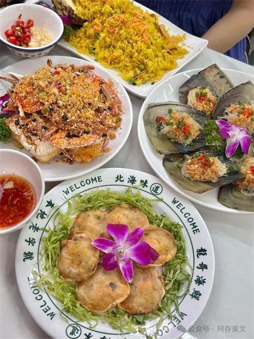 侨港风情街的招牌位于风情街与金海岸大道的交界处,招牌往下不远就是露华海鲜楼,与位于侨兴路的银龙大酒店和位于港口路的美加食府一样,都是归侨经营的酒店。侨港风情街的海鲜加侨越风味是特色,越南传统美食里的春卷、虾饼、鸡丝粉、蟹仔粉,咖喱蟹等一应俱全。疍家菜里的生猛海鲜“靠海吃海”更是食材丰富!因此,整个小镇都带着浓郁的越南风情,在这里,既可以品尝到地道的越南美食,又可以买到新奇的越南特产。另外,在炎热的夏天,侨港风情街的糖水店也深得众多游客们的喜爱。逛累了进店喝一杯海带绿豆汤、冰冻西瓜汁、杨枝甘露等饮品消消暑也是非常不错的选择呢!