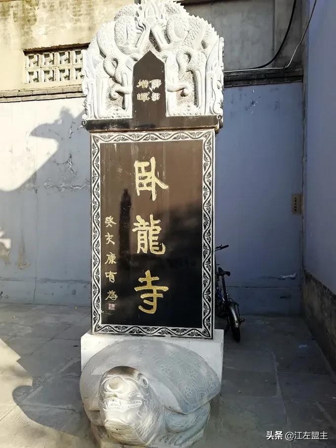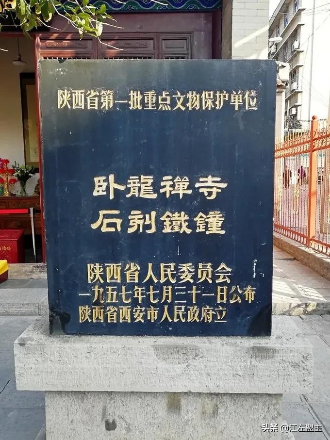 殿前旁侧立有一块石碑“ 陕西 省第一批重点文物保护单位,卧龙禅寺石刻铁钟”,专此点名石刻铁钟,应是指此寺有这两类重要文物!石碑背面就是此寺简介:“卧龙寺是著名的佛教丛 林道 场,建于东汉灵帝(公元168——189年)时期,旧名“福应禅院”,唐代画圣吴道子曾画观音像置寺中,遂改名“观音院”。后宋太祖(公元976——997年)常来此寺与卧龙禅师讲谈佛法,又更名卧龙禅寺延续至今。