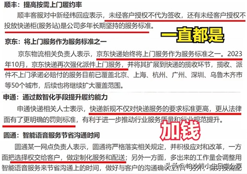 就在前天,国家对于快递行业做出了新的要求,新规自2024年3.1号开始实施,具体要求总结下来就是快递要送货上门,不要放置快递站等代取站点。文件一经颁布引起了广大民众的热议,有人称:顺丰不就是一直送货上门的吗?那对于其他快递公司(如:中通、圆通),每天的派件那么多,还能干吗?