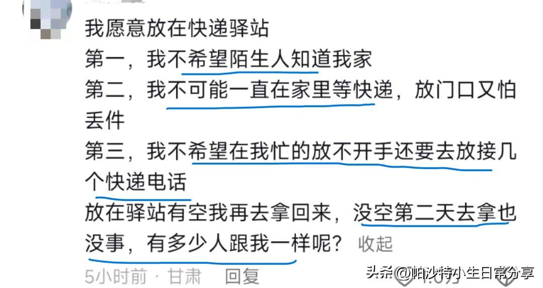 也有人提出,快递放在快递站更合理,主要有:不希望陌生人知道家在哪?没时间在家等快递的问题,说的也不是没有道理。