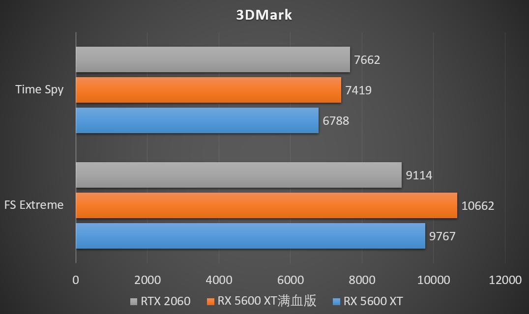 先来看3DMARK的跑分成绩,从结果来看,新BIOS的性能大概提升了约9.1%,RX 5600 XT刷完BIOS之后,FSE模式领先了2060约16.9%,TS模式落后2060约3.2%。