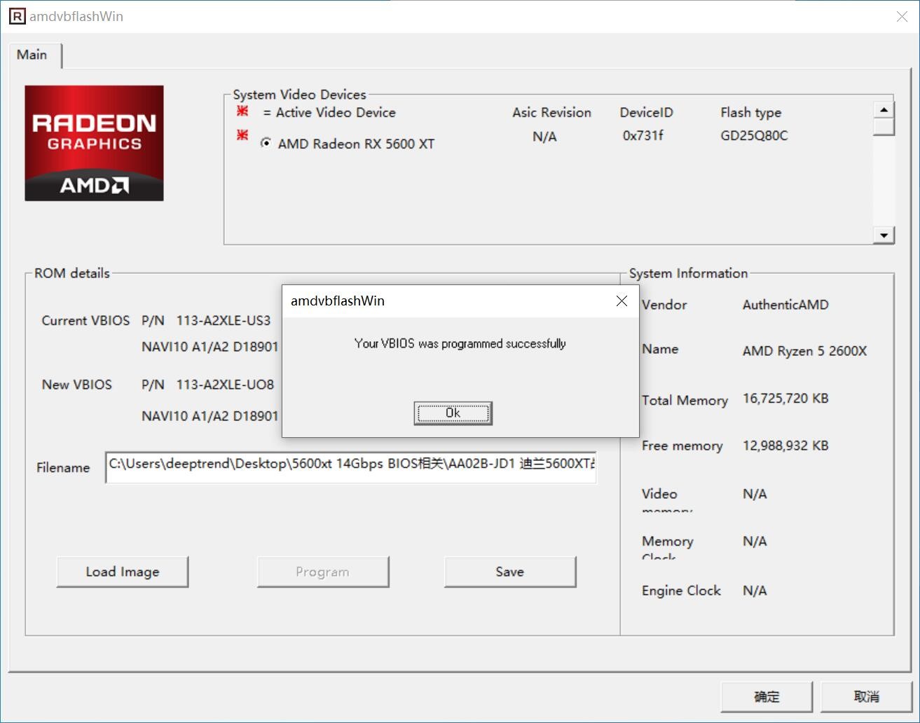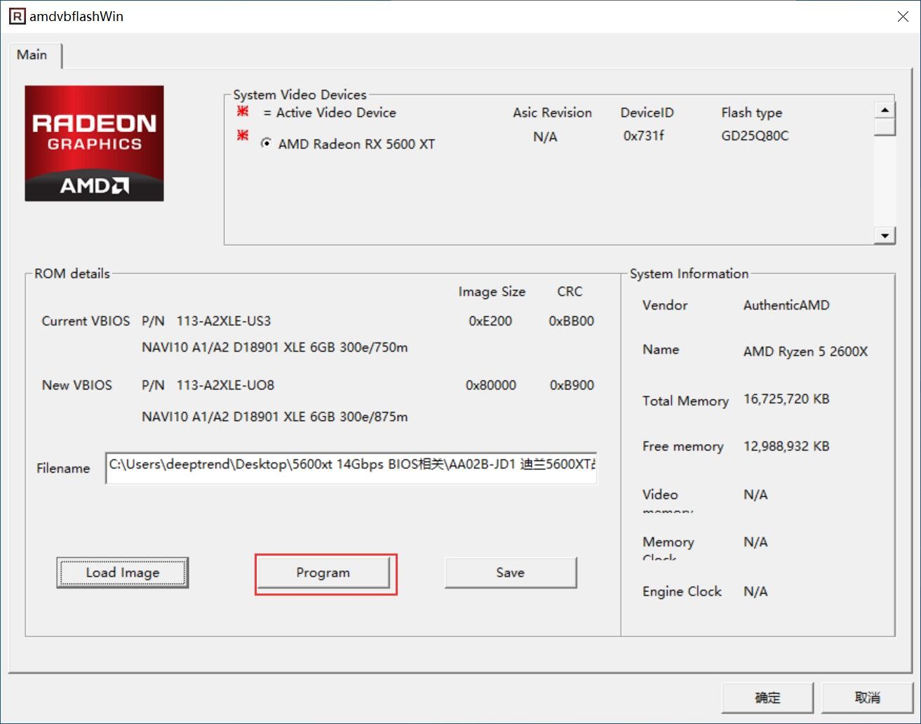 第二步就是将新BIOS刷入显卡,点击AMDVbflash的Load Image命令,选定新的BIOS所在的目录,再点Program命令。