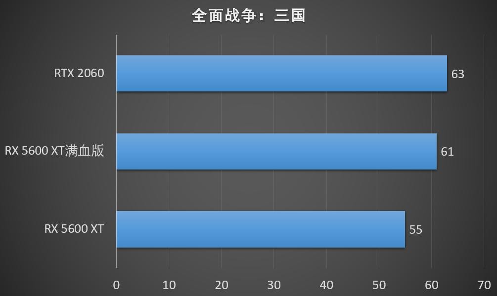 第三个看《全面战争:三国》,特效设置也是默认最高档,5600XT在刷BIOS之前落后2060 8帧,刷了BIOS之后只落后2帧。