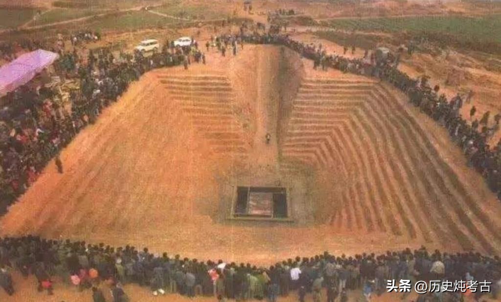 发掘后发现,这座大墓的封土直径有54米、残高6米,揭去封土,墓室呈“甲”字型,墓坑长34米、宽32米、深16米,南边的一条墓道长19米、宽10米。全部土石方量有30万立方米,如果使用载重5吨的小卡车来运输,需12万车次才能清理干净,相当于修建了一座中型水库,由此可见这座墓的工程量确实大得惊人。